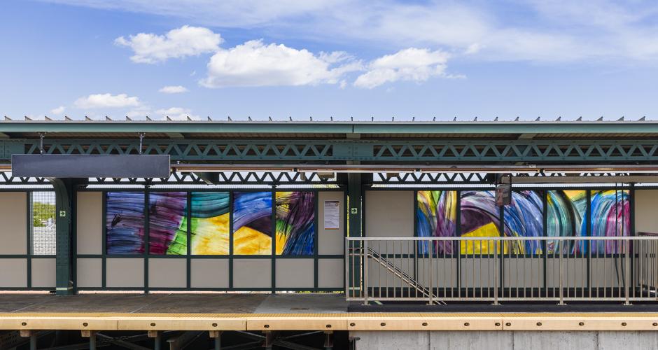 "Brooklyn Transitions" celebrates the literal and figurative movement of New Yorkers. The six unique, painted compositions emphasize motion and the blending of color in her grand and vibrant gestural abstraction. Referencing colors found throughout the neighborhood surrounding the Avenue U station, Belag’s palette and painted marks aim to mirror the diversity of New Yorkers in transit, as well as the movement of the human body in space. The boldness of the brushstrokes and color in the work is in counterpoint to the industrial station design, providing an energetic burst of creative expression.