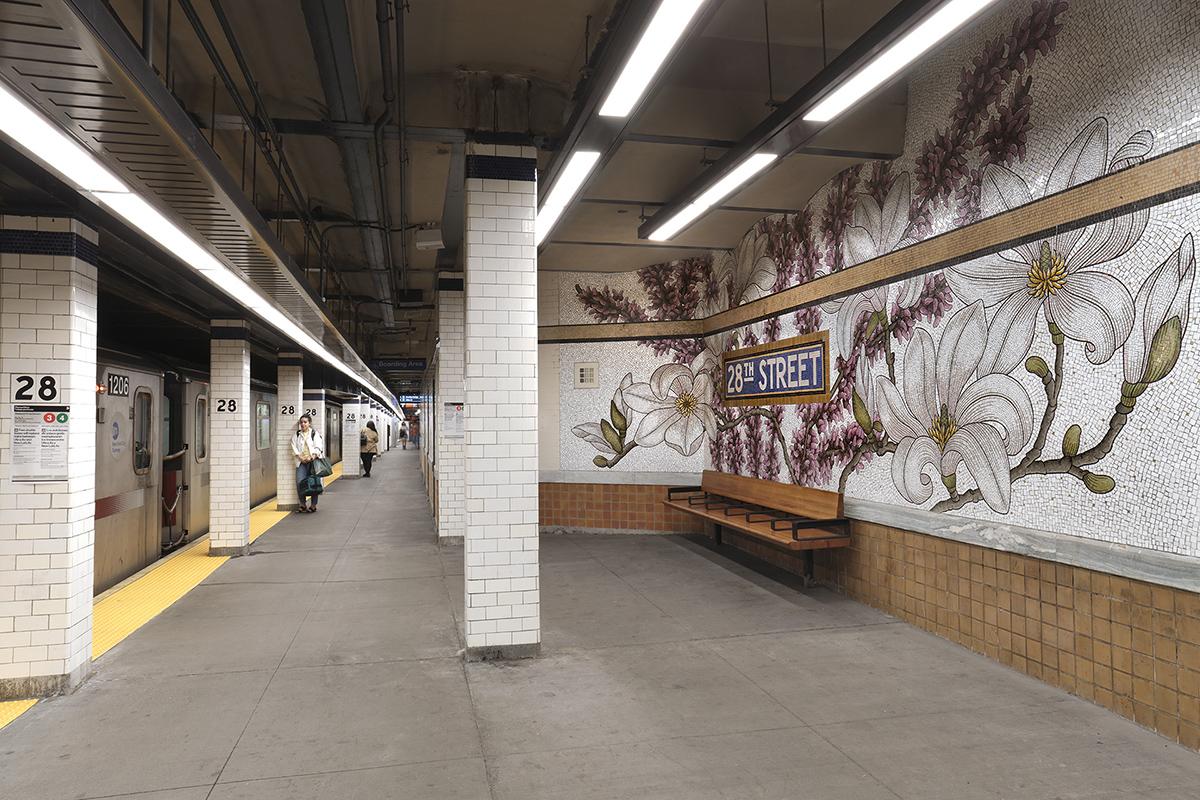 Nancy Blum’s large-scale glass mosaic botanical murals grace the platform walls of the historic 28 St station. The artwork celebrates the flowering plants that can be found in nearby Madison Square Park Conservancy’s Perennial Collection. The seven blooming plants depicted were chosen as representative of plant species that withstand changing climate conditions of the city, and include: Red Buds, Magnolias, Hellebores, Witch Hazel, Daffodils, Hydrangea, and Camellia.