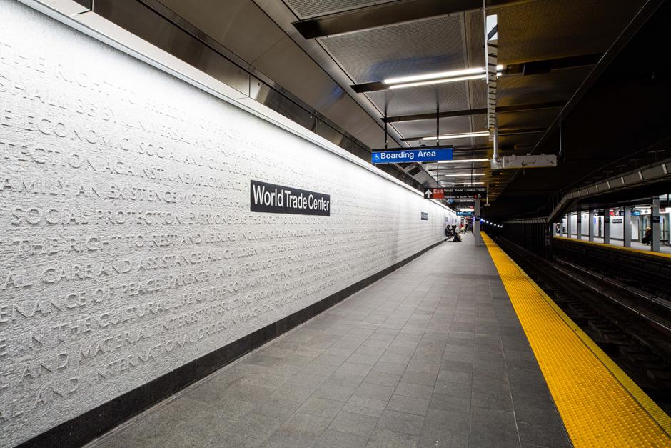 The artwork features a woven field of text taken from the U.S. Declaration of Independence and the 1948 United Nations Universal Declaration of Human Rights, which conveys a universal language and a timeless artistic excellence, bringing a calming quality to a charged place. This concordance of Rights and Declarations creates an immersive environment to be experienced by riders as they pass by the station’s platform walls.