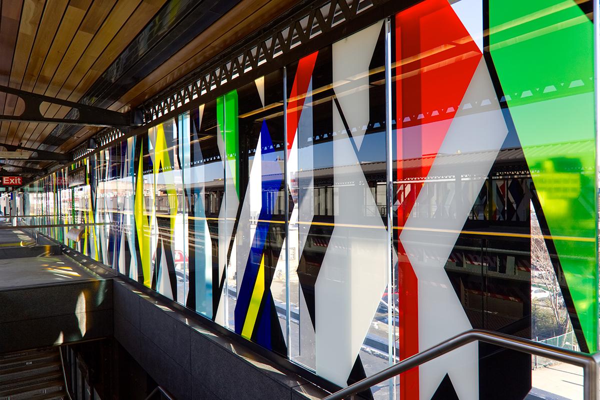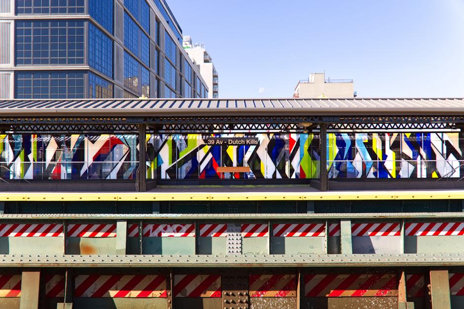 "Hellion Equilibrium" is a vibrant tempered and laminated colored glass project by Sarah Morris. Installed on the elevated platforms of the 39 Av- Dutch Kills station, Morris’ project can be seen from both the platform and the street below. "Hellion Equilibrium" provides an evolving spectrum of color and sharp-edged shapes that invites the viewer to reflect upon the concepts of motion, scale, light, mapping, and social space through the use of organically evolving forms.