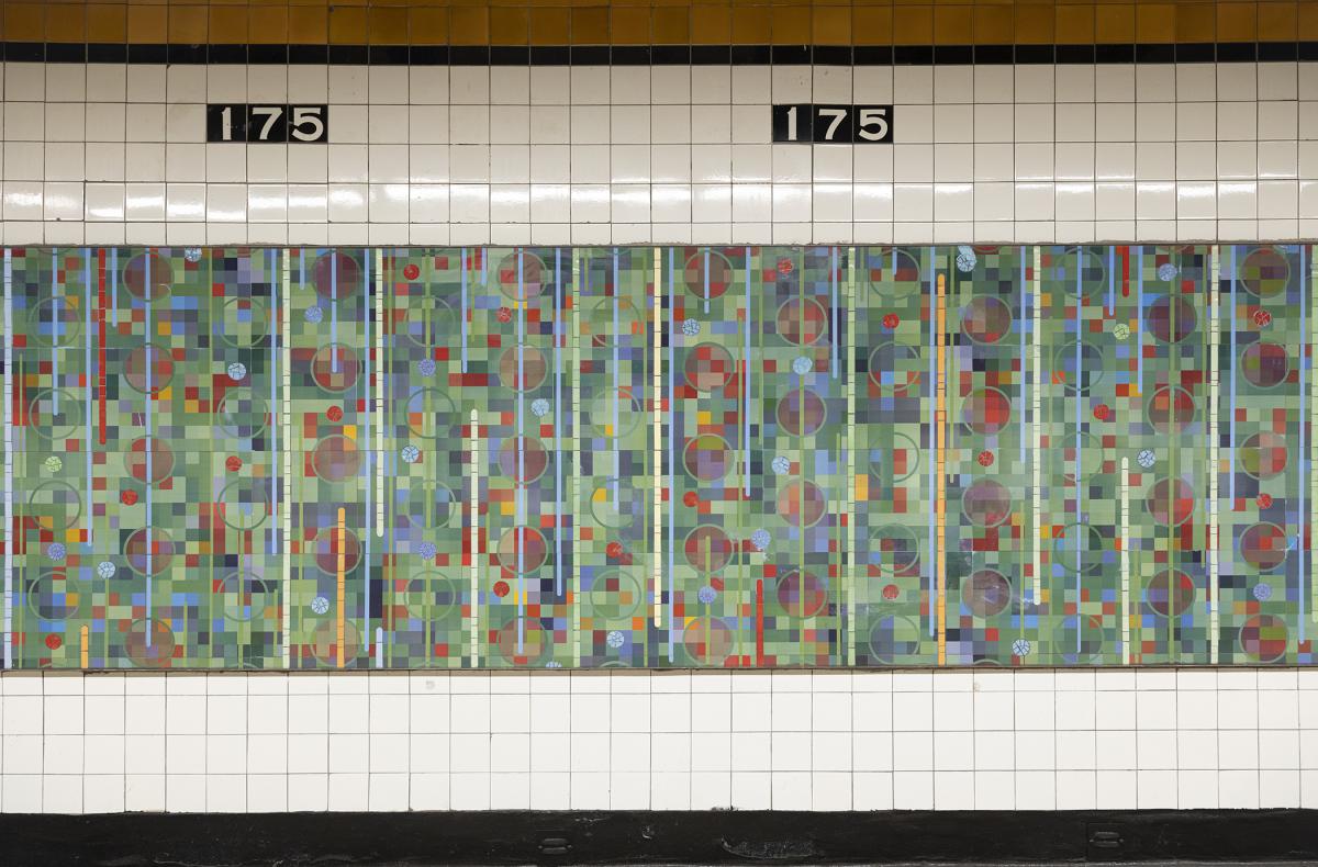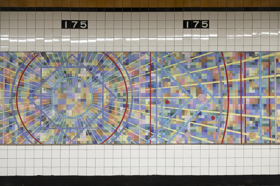 For the 174-175 St station, Roy Secord created large-scale abstract paintings that are rooted in mindfulness, geometry and the balance between simplicity and complexity. The artwork is inspired by Secord’s own walking meditations in nature taken throughout the year. The piece, "Bronx Seasons Everchanging," captures the color atmospheres of annual cycles of spring, summer, fall, and winter, as well as their transitions.