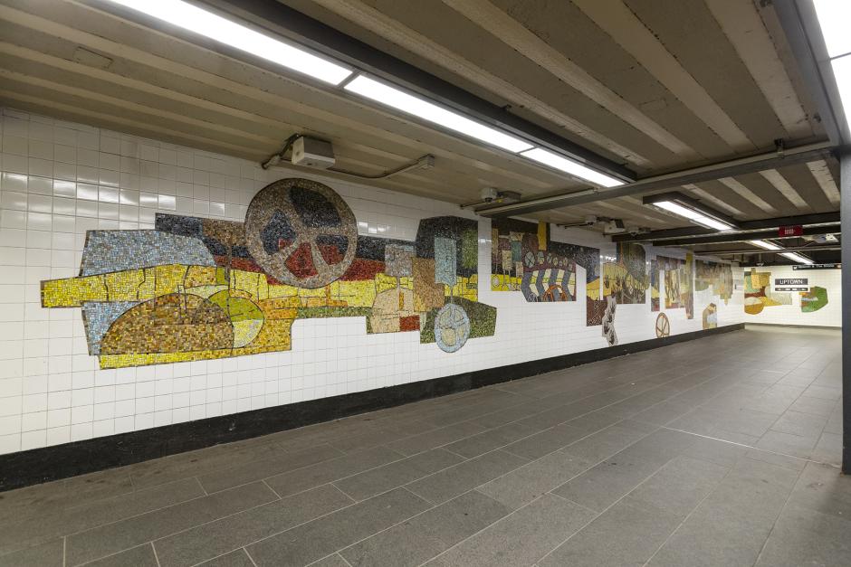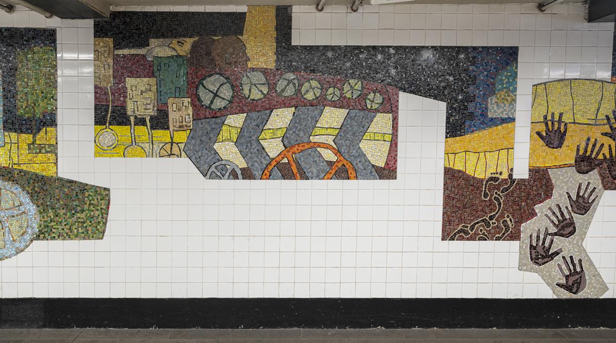 As part of the 2018 station improvements, artist Chris Wynter extended his glass mosaic artwork, Migration, at Cathedral Parkway-110 St Station. Located near Frederick Douglass Circle, a gateway to Harlem, the artwork was originally installed in 1999 by Miotto Mosaic Art Studios, and it continues to evoke the spirit of migration, both of people who have found their home in Harlem, as well as the universal search for the feeling of home--in one’s heart and in the world. Imagery in the artwork includes houses atop stilts and wheels, ladders, the North Star, footprints, recurring circular patterns (both complete and incomplete), and African symbols of spiritual centering. These objects and a continuous pathway weave in and out of large simple shapes throughout the station, threading through the shifting dynamics of passage.
