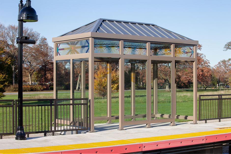 "American Season" is a meditation on seasonal changes, living in harmony with nature and each other, and societal changes that come with the passing of time. Judge’s work is installed in three parts at both the Wyandanch and Pinelawn stations, which can be seen from multiple perspectives. At Wyandanch, that includes from the approaching train, walking through the Wyandanch station house along the overpass, and from the platform below. At Pinelawn, that includes from the approaching train and walking through the shelter shed.