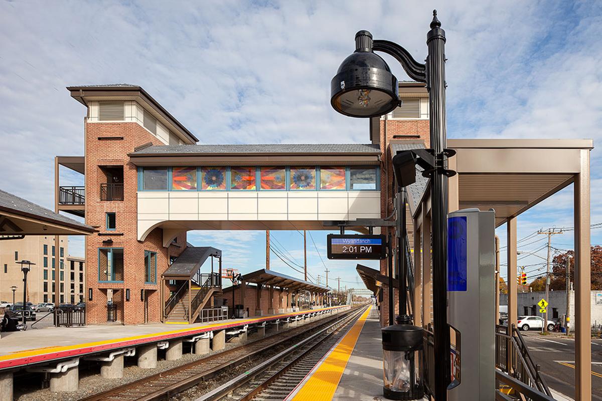 Rich colors radiate and envelop viewers passing through "American Season" in the Wyandanch station overpass bridge and "American Season" in the Pinelawn station platform shelters. The bold lines recall the flare of approaching train headlights, or the speeding up and slowing down of a train. The symbolic expansion and contraction is punctuated with stylized flower beacons that are rendered in the style of a homemade sewing sampler. The recurring motif expresses the marriage of place, nature, and the technology of train travel.