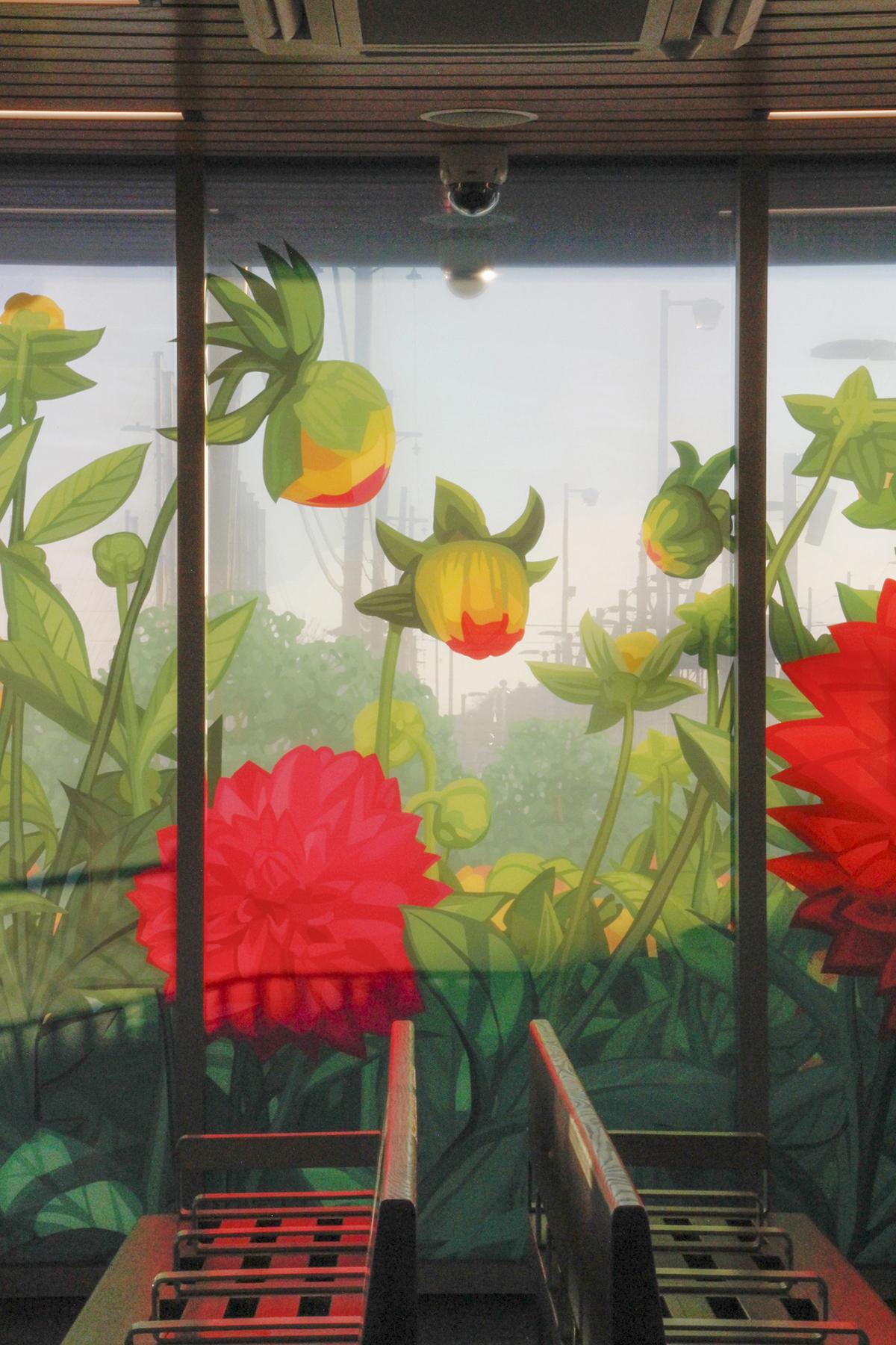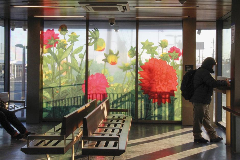 William Low’s artwork at the LIRR Deer Park station creates a contemplative space in the station waiting room. The vibrantly colored dahlias situated in a pastoral field were translated into laminated glass by Tom Patti Design. The large scale of the flowers shift the viewer’s perspective and provide an experience of childlike wonder in the natural world.