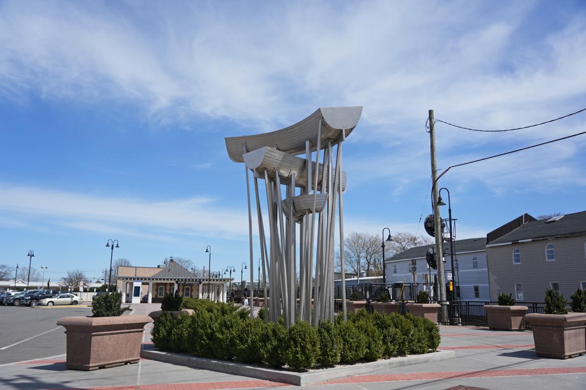 David McQueen's stainless steel sculpture at the Port Jefferson station features three ships once built in Port Jefferson (a schooner, a yawl, and a sloop), and he wanted them to "sail through its consciousness." Each is positioned to curve as if sailing through the sea, and held aloft by 52 boat stands. The ships, fabricated by KC Fabrications, are modified re-creations of those built here during the mid-1800s at the Bayles and Darling Shipyards.