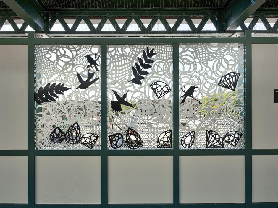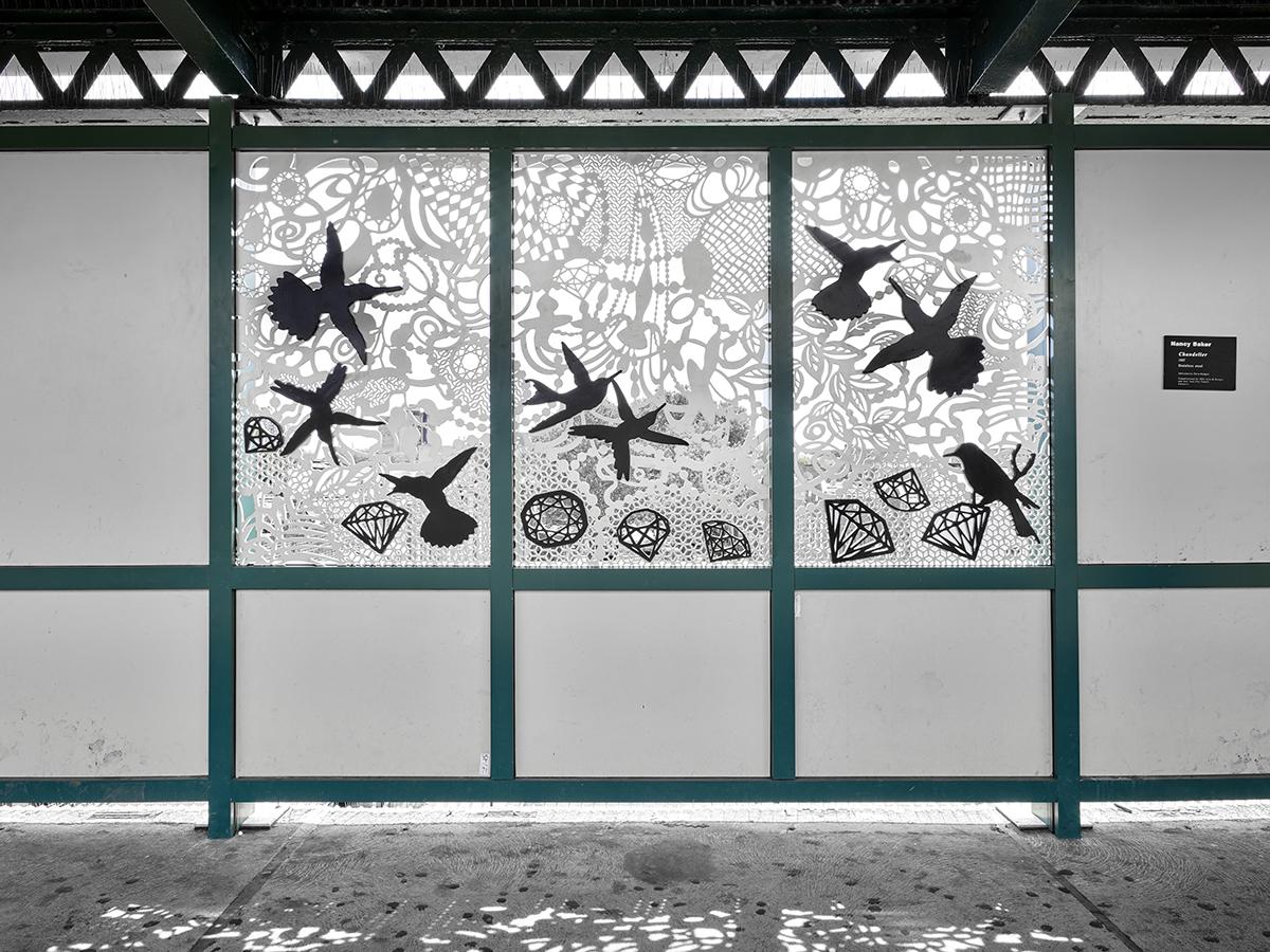 "Chandelier" references the idea of "lighting the way," and is a reminder of the feeling when the lights of the train appear down the tracks, signaling the journey home. Hummingbirds are elegant and high-energy, representing the vibe of Brooklyn. In creating the artwork, Baker recalled her childhood car journeys with her parents and the feeling of spotting an iconic colorful building. She seeks to capture the same moment of wonder by creating public art that can be transformative and speak to everyone.