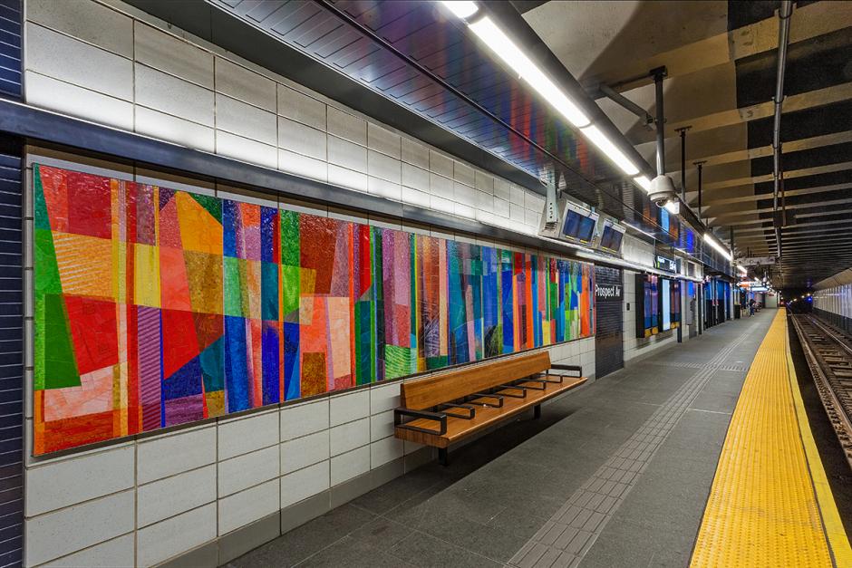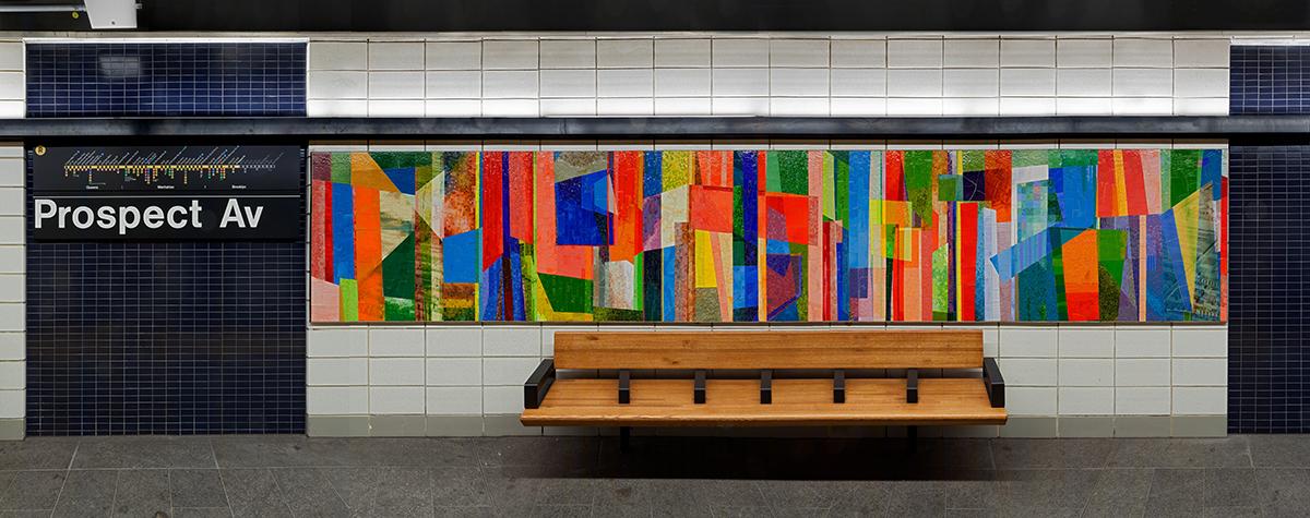 "Duration," located at Prospect Av station, was created by Monika Bravo, a Colombian-born, Brooklyn-based artist who has created site-specific, public installations in the U.S. and internationally. Bravo works with animation, sound, photography, and digital technology to explore time, space, and memory. Arising from her ongoing research of color and rhythm, the bold abstract patterns seen in "Duration" seem to pulsate with vibrant waves of energy. Data and material are woven together to create a new code that connects technology, process, and illusion. The composition layers forms drawn from Modern Abstraction, pixelated satellite images presented in mosaic tesserae, and historical maps and photos of the nearby waterfront.