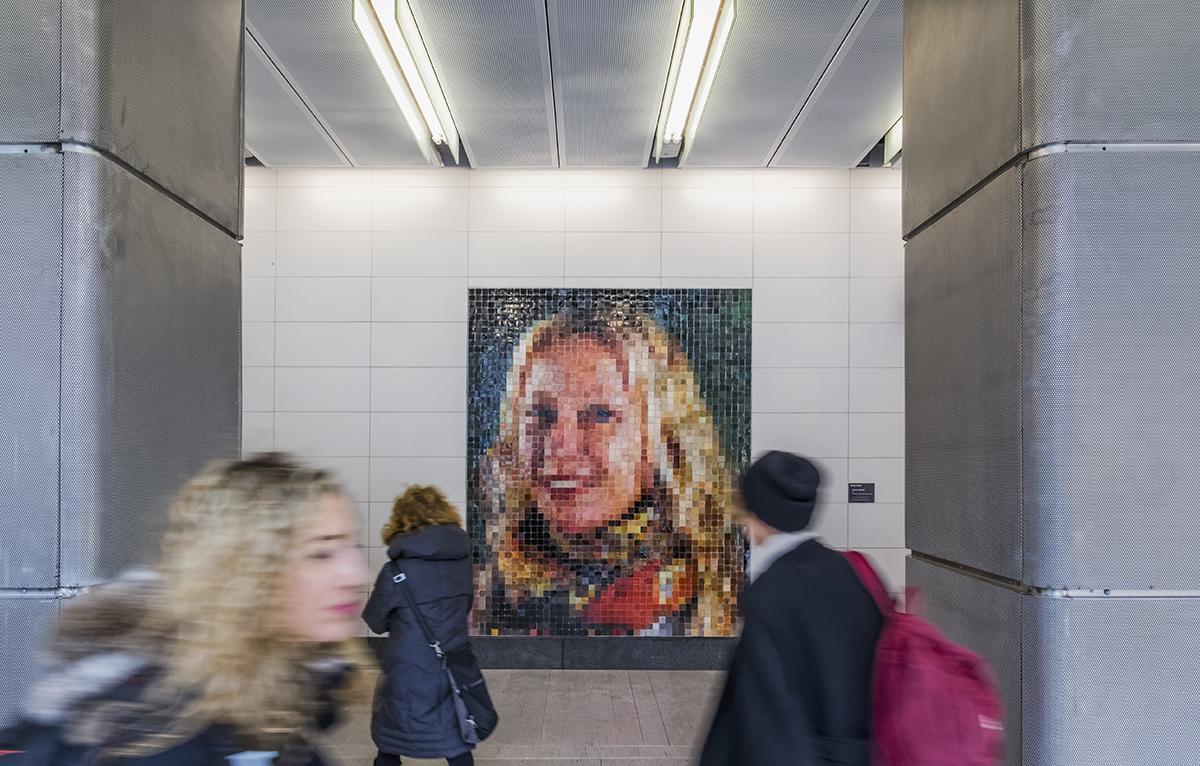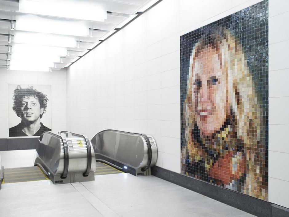 Chuck Close created 12 large-scale portraits for 86 St that are based on the artist’s painstakingly detailed photo-based paintings. His various painting techniques have been interpreted in 10 works as mosaic, and in two as ceramic tile. The people portrayed represent the variety of individuals that pass though the MTA system, and are chiefly cultural figures that have frequently been subjects in his artistic career spanning over half a century, including Philip Glass, Zhang Huan, Kara Walker, Alex Katz, Cecily Brown, Cindy Sherman, and Lou Reed, as well as two distinct self-portraits.