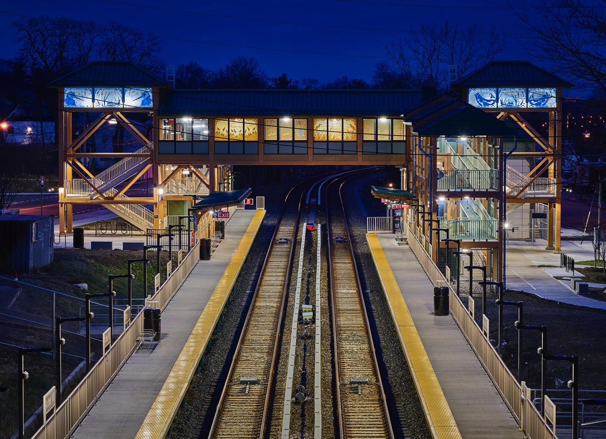Jenna Lucente designed 28 large-scale laminated glass panels that are located within the two station towers that provide connection to the platforms and the pedestrian overpass of the newly built Arthur Kill station on Staten Island.