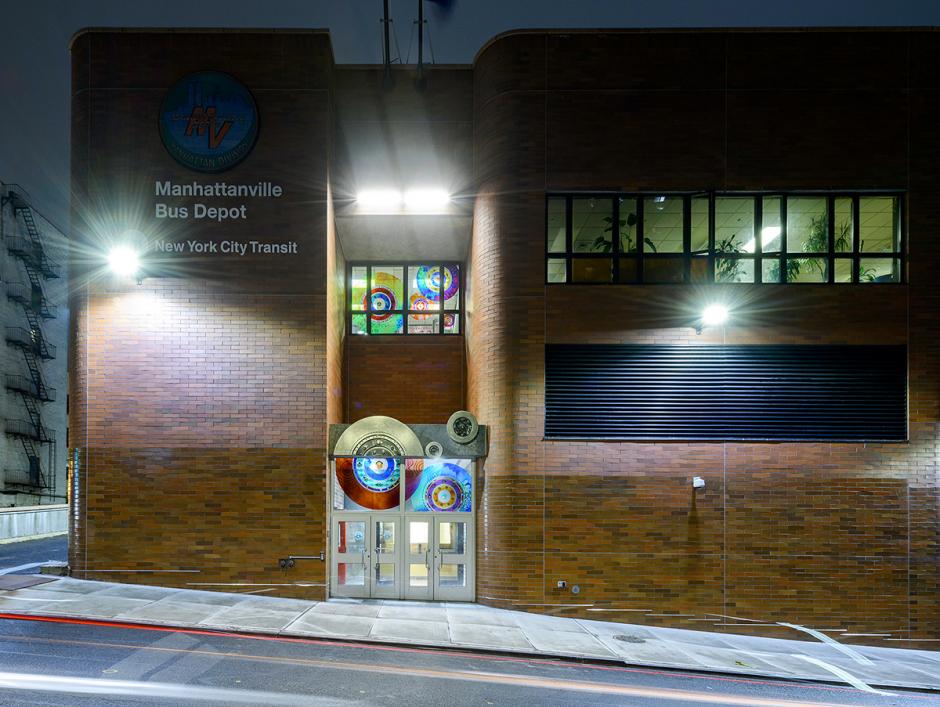 For the Manhattanville Bus Depot, Tomo Mori designed "The Wheels on the Bus," which consists of 10 glass panels and a metal sculptural piece. The artist created giant wheels for the main entrance of the depot, inspired by MTA buses and the people who keep New York City moving.
