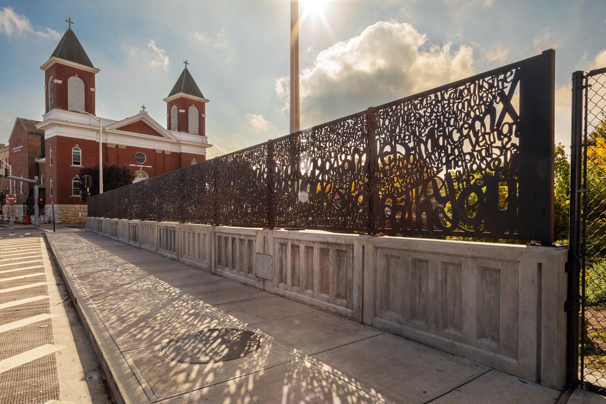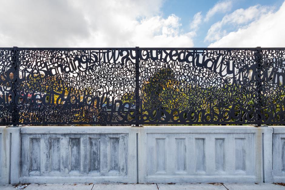 Composed of 14 dynamic waterjet cut panels, fabricated by Milgo/Bufkin, and spanning approximately 550 square feet, the artwork features densely patterned words, undulating throughout the span of the bridge and evoking a train yard of crisscrossing tracks. The text is intended to be seen as an all-over pattern, and for viewers to spot singular words and phrases, or to see full sentences over time. To create the content for the text, Fox researched the history and factual information about Mount Vernon, reflected on his own experience in the city, and undertook in-depth conversation with local historians. While not necessary to the experience of the visual artwork, the text is a playful statement from the point of view of the bridge, its place in the world and time, and its relationship to the train that runs below.