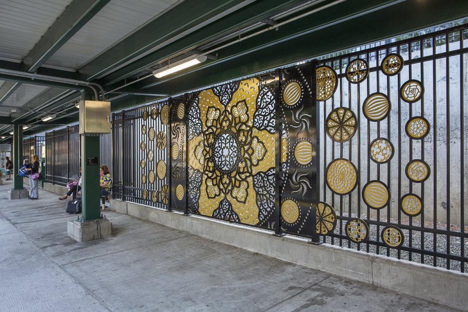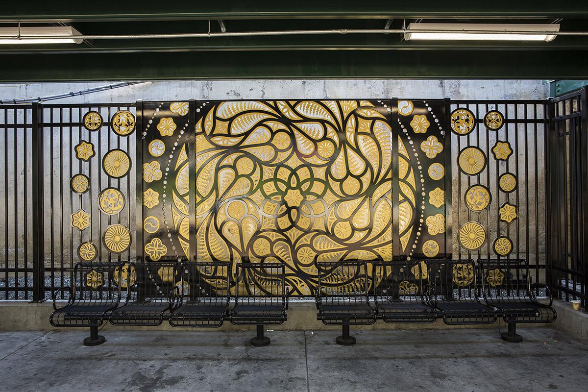 The artwork is fabricated by KC Fabrications. Each of the four windows is composed of two layers of water jet-cut aluminum in black and gold, recalling the Gothic Revival era. Circular frames, which house the smaller discs orbiting each large rose window, are built into the metal fence. This effect creates a transition from the artwork panels to the rest of the unadorned platform fence. The visual effect is explosive when seen from a passing on the train or across the platform. Funderburgh references and connects history, architecture and natural beauty in an inventive and imaginative work of public art that transforms the station.