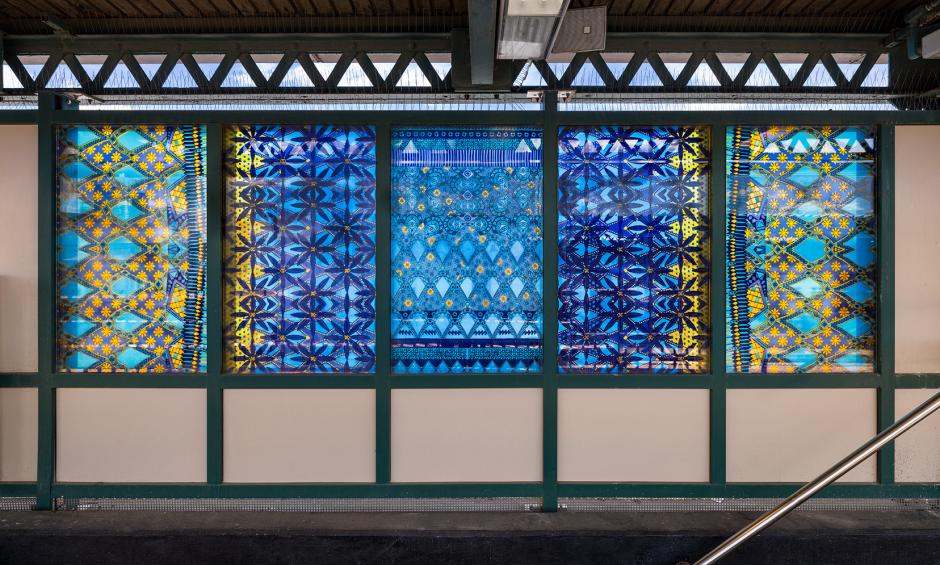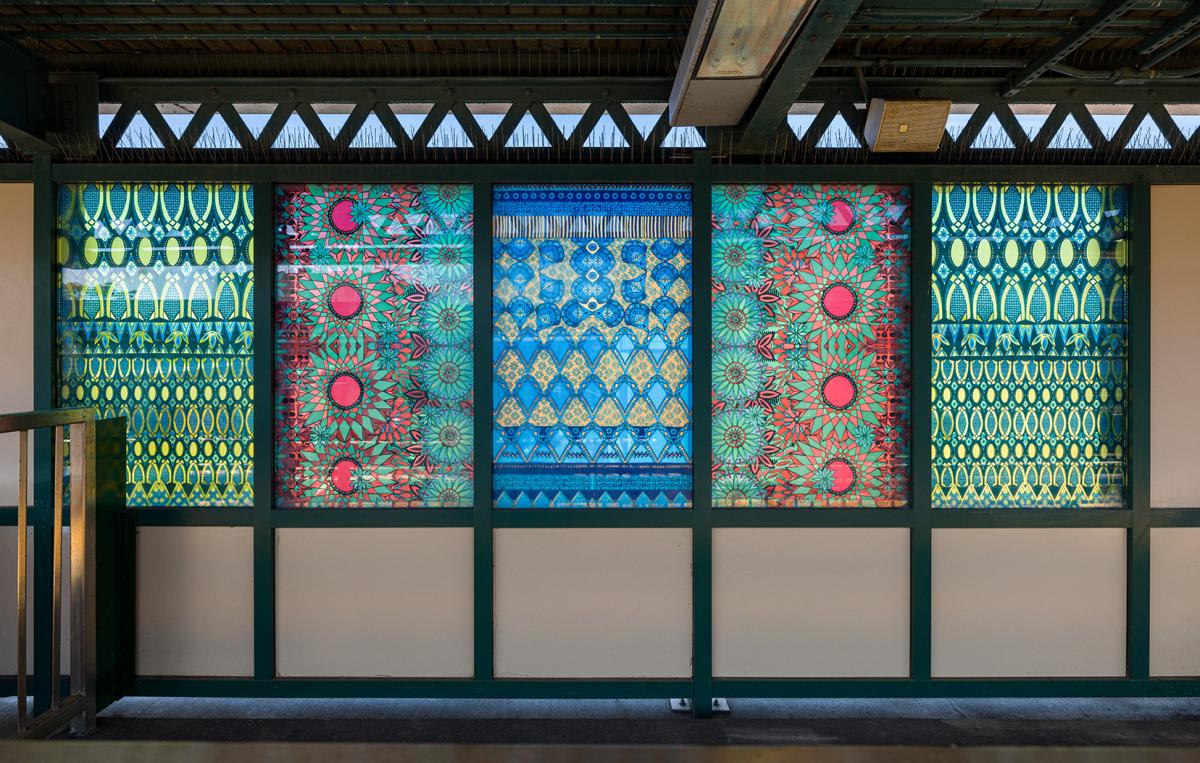 Lynch was inspired by the decorative elements in household glassware that was mass-produced and widely available during the late 19th and first half of the 20th centuries, the same period when Brooklyn neighborhoods were developing rapidly and subway stations were being built. Sourcing decorative patterns commonly seen in American pressed glass, milk glass, cut glass, Depression glass, and carnival glass, Lynch transformed these elements into kaleidoscopic abstractions for the platform windscreens. Fabricated by Peters Glass, the resulting work in six sets of bold and vibrant compositions represents the people of the community, as well as the promising lifestyle desired by those who settled in the neighborhood the station serves.