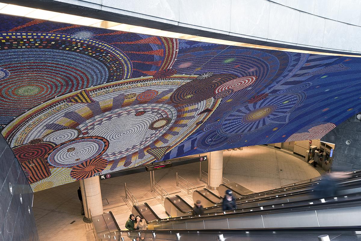 Xenobia Bailey’s artwork consists of majestic mosaics suspended above the main entrance of the new 34 St-Hudson Yards station that provide a celebratory welcome. The art crowns the station and features overlapping mandala-like circles and patterns against a cobalt blue background. In the upper right a sun-like form emits rays of color bands. Starbursts of bright light appear through the blue background. The glass mosaic artwork is vibrant, joyous and rich with pattern and texture and among the largest in Arts & Design’s collection of commissioned works in the MTA transit network.