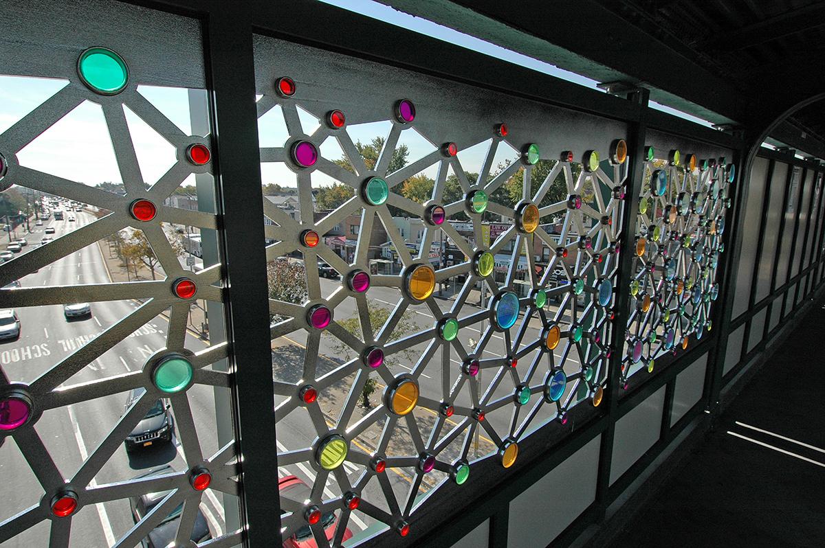 "Connections" consists of a series of four portals, each of which has three panels, created with stainless steel and colored glass screens that use light, color, shadow, and texture to animate the platform and roadway below the elevated Rockaway Blvd station. "Connections" has hundreds of laminated colored glass discs encased in bezels that animate and enliven the experience of MTA passengers passing through the station. The size and density of the glass elements are gradated horizontally to simulate the movement of the trains.