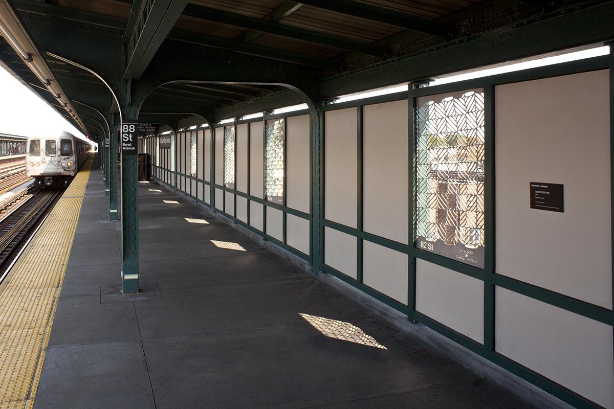 "MORPHING88" consists of 24 laser-cut stainless steel panels depicting patterns with morphed shapes. To create the artwork, Lalvani researched the unique geography of the neighborhood in relation to the A stations in order to gather data and make calculations to create each of the distinct patterns and shapes of the artwork panels. Located on the platform of 88 St, the artwork panels morph from one to another and, like the station itself, are stationary points in a continuously morphing pattern that captures time, which is the basis of transport. These abstract works are grounded in place, and over time the residents who use the station will become as familiar with the flow of the artwork, as they are with the movement of the subway through their daily journey.