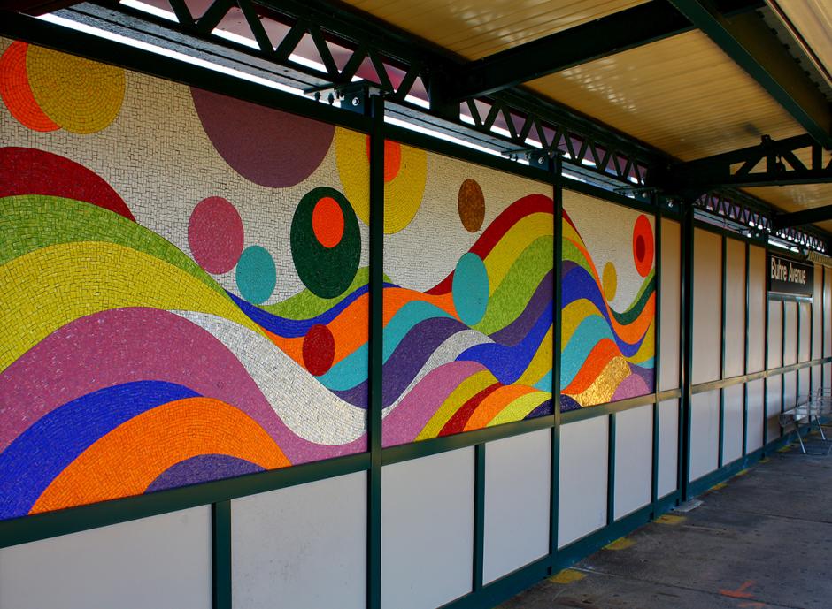 Have a Happy Day consists of six mosaic murals of colorful geometric abstract forms, located on the elevated station platforms. Resonating with the landscape of the neighborhood, the vibrant, whimsical arrangements interact with the bright, open sky and the natural light. The rigid lines and square structures, on the southbound platform, are reflective of the buildings and the journey towards Manhattan, while the curved lines and circular motifs, on the northbound platform, are symbolic of nature and Pelham Bay.