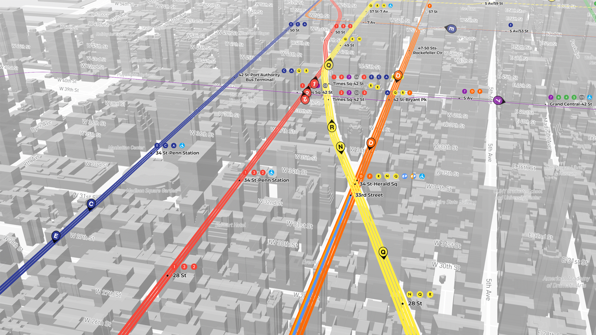 The interactive 3D nyc subway map makes the network easier to read by improving spatial clarity. This is especially useful for understanding how lines intersect and where trains are moving in relation to each other.